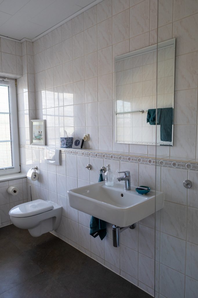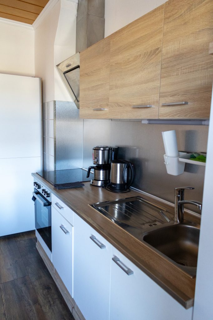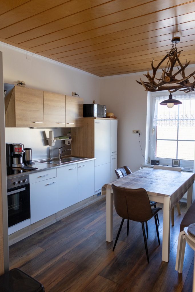 Die liebevoll eingerichtete, gemütliche Küche unserer Ferienwohnung lädt mit ihrem charmanten Ambiente zum entspannten Verweilen und fröhlichen Beisammensein ein. Das helle, freundlich gestaltete Gemeinschaftsbad sorgt mit seiner modernen Ausstattung und täglich für ein rundum wohltuendes Gefühl.